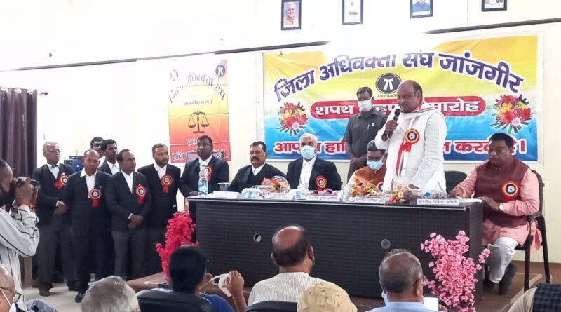 रायपुर, 21 फरवरी 2022- जांजगीर-चांपा जिले के जिला अधिवक्ता संघ के शपथ ग्रहण समारोह में विधानसभा अध्यक्ष डॉ. चरणदास महंत और राजस्व आपदा प्रबंधन एवं जिले के प्रभारी मंत्री जयसिंह अग्रवाल शामिल हुए। महंत ने इस अवसर पर कहा कि सभी अधिवक्ता गरीबों को सहज, सरल और सुलभ न्याय मिले, इसके लिए सकारात्मक सोच से काम करें। अग्रवाल ने कहा कि जरूरत मंदों को न्याय दिलाने अधिवक्ताओं की महत्वपूर्ण भूमिका होती है। यह कार्यक्रम जांजगीर-चांपा जिले के जिला न्यायालय परिसर स्थित सभागार में आयोजित हुआ। इस अवसर पर अतिथियों ने अधिवक्ता संघ के नवनिर्वाचित अध्यक्ष नरेश शर्मा को बधाई एवं शुभकामनाएं दी। शर्मा तीसरी बार अध्यक्ष के पद पर निर्वाचित हुए है।