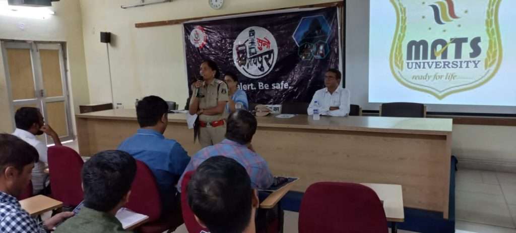 रायपुर। मैट्स विश्वविद्यालय गुल्लू आरंग मुख्य परिसर में रायपुर पुलिस प्रशासन विभाग के तत्वावधान में आरंग थाना के टीआई श्री मती कमला पुसाम ठाकुर और उनके टीम द्वारा साइबर क्राइम पर जागरूकता अभियान पर सेमिनार का आयोजन रखा गया । जिसमे विश्वविद्यालय के प्राध्यापक एवं विद्यार्थियों ने अपनी सक्रिय भागीदारी प्रकट की। कार्यक्रम का संचालन मैट्स कॉलेज के प्राचार्य प्रोफेसर डॉक्टर ए जे खान द्वारा किया गया । टी आई मैडम का आत्मीय स्वागत एजुकेशन डिपार्टमेंट के विभागाध्यक्ष प्रोफेसर डॉक्टर परविंदर हंसपाल द्वारा किया गया । साथ ही लॉ डिपार्टमेंट के विभागाध्यक्ष डॉक्टर ब्रिजेन्द्र सिंग यादव भी मंच पर उपस्थित थे ।