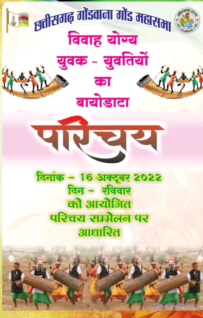 छत्तीसगढ़ गोंडवाना गोंड महासभा द्वारा आयोजित युवक-युवती परिचय सम्मेलन पर आधारित बायोडाटा पत्रिका का विमोचन माननीय श्री कवासी लखमा जी के शासकीय आवास शंकर नगर रायपुर में दिनांक 24 नवंबर 2022, दिन – गुरुवार ,संध्या 4:00 बजे माननीय श्री कवासी लखमा जी केबिनेट मंत्री उद्योग एवं आबकारी छत्तीसगढ़ शासन के कर–कमलों से विमोचन होगा।अध्यक्षता माननीय श्री नीलकंठ टेकाम जी (IAS) प्रदेश अध्यक्ष गोंडवाना गोंड महासभा करेंगे।