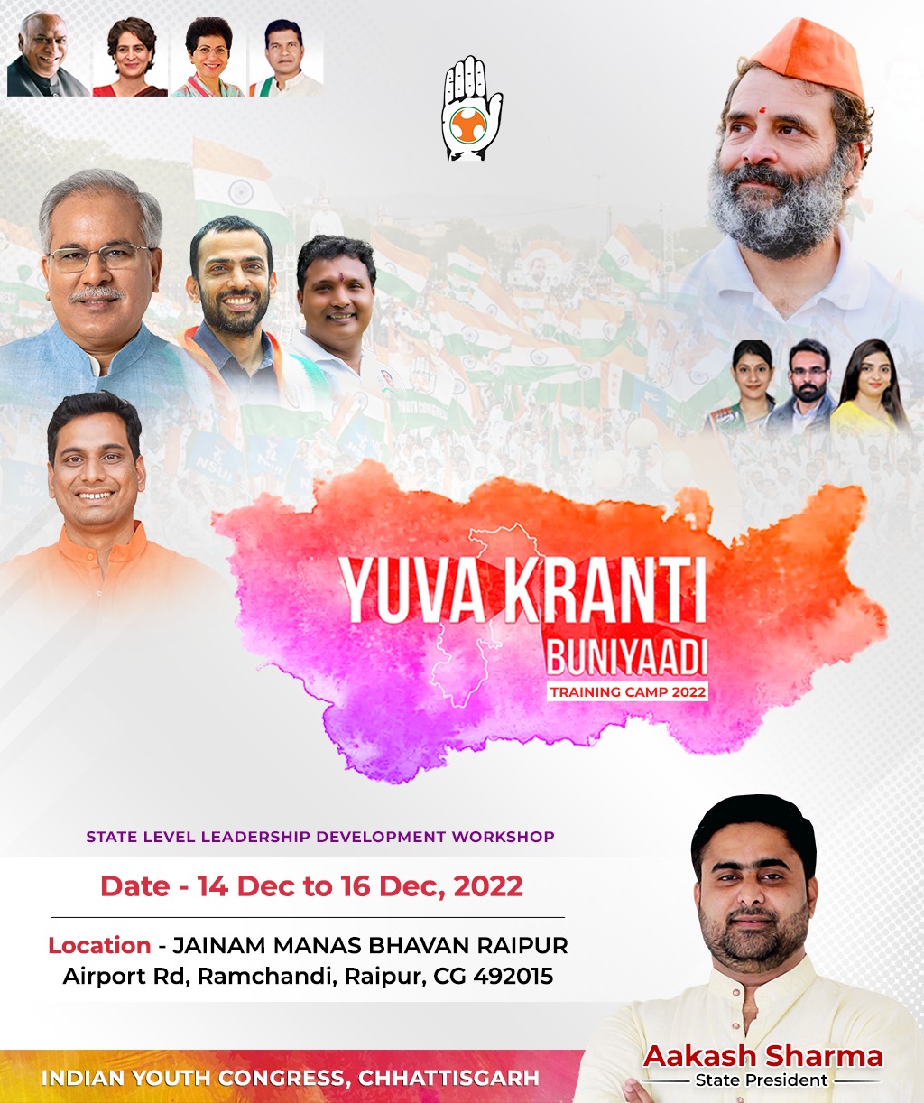 छत्तीसगढ़ युवा कांग्रेस द्वारा दिनांक 14/12/220 को जैनम भवन वीआईपी रोड से तीन दिवसीय प्रशिक्षण शिविर का आयोजन किया गया है इस प्रशिक्षण शिविर का नाम “युवा क्रांति बुनियाद” रखा गया है इस प्रशिक्षण शिविर में युवा कांग्रेस के सभी निर्वाचित प्रदेश पदाधिकारी जिलाध्यक्ष एवं विधानसभा अध्यक्ष शामिल होंगे इसमें 3 दिन तक विभिन्न तरह के कार्यक्रम का आयोजन किया जाएगा इस कार्यक्रम में राष्ट्रीय के नेतृत्व प्रदेश कांग्रेस पार्टी शामिल होंगे।।