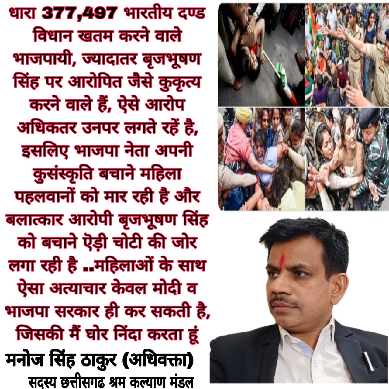 *धारा 377,497 भारतीय दण्ड विधान खतम करने वाले भाजपायी, ज्यादातर बृजभूषण सिंह पर आरोपित जैसे कुकृत्य करने वाले हैं, ऐसे आरोप अधिकतर उनपर लगते रहें है, इसलिए भाजपा नेता अपनी कुसंस्कृति बचाने महिला पहलवानों को मार रही है और बलात्कार आरोपी बृजभूषण सिंह को बचाने ऎड़ी चोटी की जोर लगा रही है ..महिलाओं के साथ ऐसा अत्याचार केवल मोदी व भाजपा सरकार ही कर सकती है, जिसकी मैं घोर निंदा करता हूं*