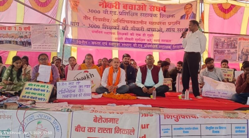 बस्तर एवं सरगुजा संभाग के तीन हजार बी. एड प्रशिक्षित सहायक शिक्षको के साथ कड़कड़ाती ठंड में कई माताएं छोटे-छोटे दूधमुहे बच्चों को लेकर अपनी सेवा सुरक्षा की मांग की पूर्ति के लिए अंबिकापुर से रायपुर पदयात्रा करते हुए तुता धरना स्थल पर अनिश्चितकालीन धरना पर बैठे हुए हैं। उनके जायज मांगों का समर्थन करते हुए अनुसूचित जनजाति शासकीय सेवक विकास संघ छत्तीसगढ़ के प्रांताध्यक्ष आर एन ध्रुव द्वारा धरना स्थल पर जाकर समर्थन दिए। इस अवसर पर उन्होंने सहायक शिक्षकों को संबोधित करते हुए कहा कि पूरे जीवन भर तैयारी करने के बाद व्यापम के माध्यम से आप सभी लाखों लोगों में से चयनित होकर आए हैं। कई लोगों ने इस पद में आने के लिए अन्य नौकरियां को छोड़ें, व्यापार व्यवसाय छोड़ें हैं। आज छत्तीसगढ़ शासन द्वारा टर्मिनेशन आदेश निकालकर आप लोगों को सड़क पर लाकर छोड़ दिए हैं। श्री ध्रुव जी ने कहा की छत्तीसगढ़ में कई हजार शिक्षकों के पद खाली है। शासन से मांग करते हुए कहा कि इन सहायक शिक्षकों को पद से बर्खास्त न कर अतिशीघ्र इन खाली पदों में समायोजन का रास्ता निकालना चाहिए।