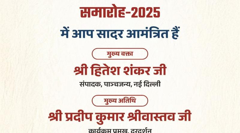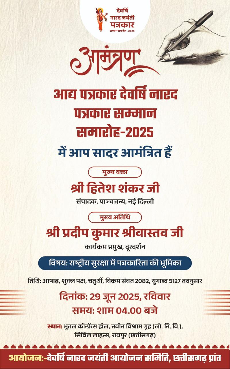 रायपुर। देवर्षि नारद जयंती समारोह आयोजन समिति छत्तीसगढ़ प्रान्त द्वारा आद्य पत्रकार देवर्षि नारद जयंती के उपलक्ष्य में पत्रकारिता सम्मान समारोह आयोजित किया गया है। 29 जून 2025 को शाम 4 बजे नवीन विश्राम गृह (लो.नि.वि.), भू-तल कांफ्रेंस हॉल, सिविल लाइन, रायपुर में यह कार्यक्रम संपन्न होगा। इस अवसर पर पाञ्चजन्य, नई दिल्ली के संपादक हितेश शंकर मुख्य वक्ता होंगे और ‘ राष्ट्रीय सुरक्षा में पत्रकारिता की भूमिका ‘ विषय पर अपना उद्बोधन देंगे। कार्यक्रम के मुख्य अतिथि दूरदर्शन के कार्यक्रम प्रमुख प्रदीप कुमार श्रीवास्तव होंगे। इस समारोह में राजधानी के आई बी सी के वरिष्ठ पत्रकार सतीश सिंह ठाकुर को देवर्षि नारद पत्रकारिता सम्मान से सम्मानित किया जायेगा। समारोह में आई एन एच के पत्रकार एवं एंकर मधुमिता पाल को वरिष्ठ पत्रकार बबनप्रसाद मिश्र स्मृति सम्मान और दैनिक नवभारत के फोटो जर्नलिस्ट दीपक पाण्डेय को वरिष्ठ पत्रकार रमेश नैयर स्मृति सम्मान से सम्मानित किया जायेगा।
