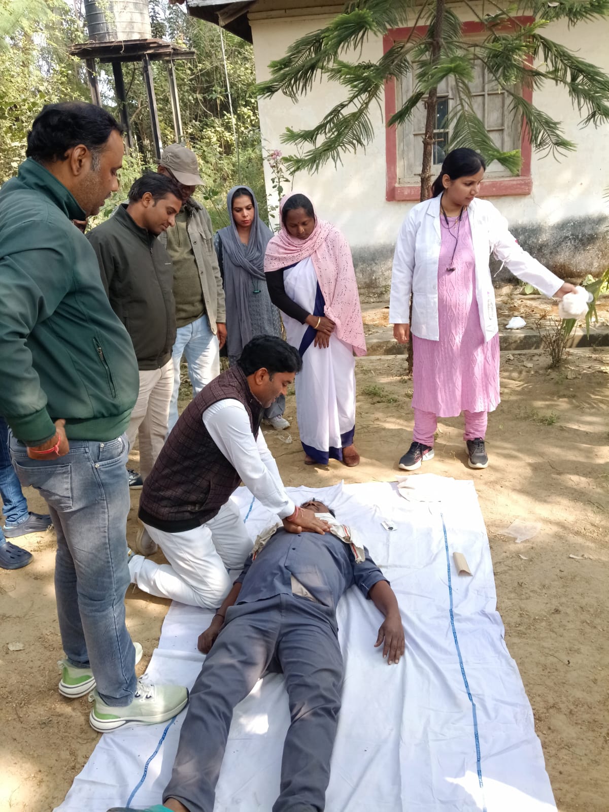 *स्ट्रेचर के उपयोग का प्रदर्शन* – घायल व्यक्तियों को सुरक्षित रूप से उठाने, स्थानांतरित करने तथा परिवहन की सही तकनीकों का अभ्यास कराया गया ।