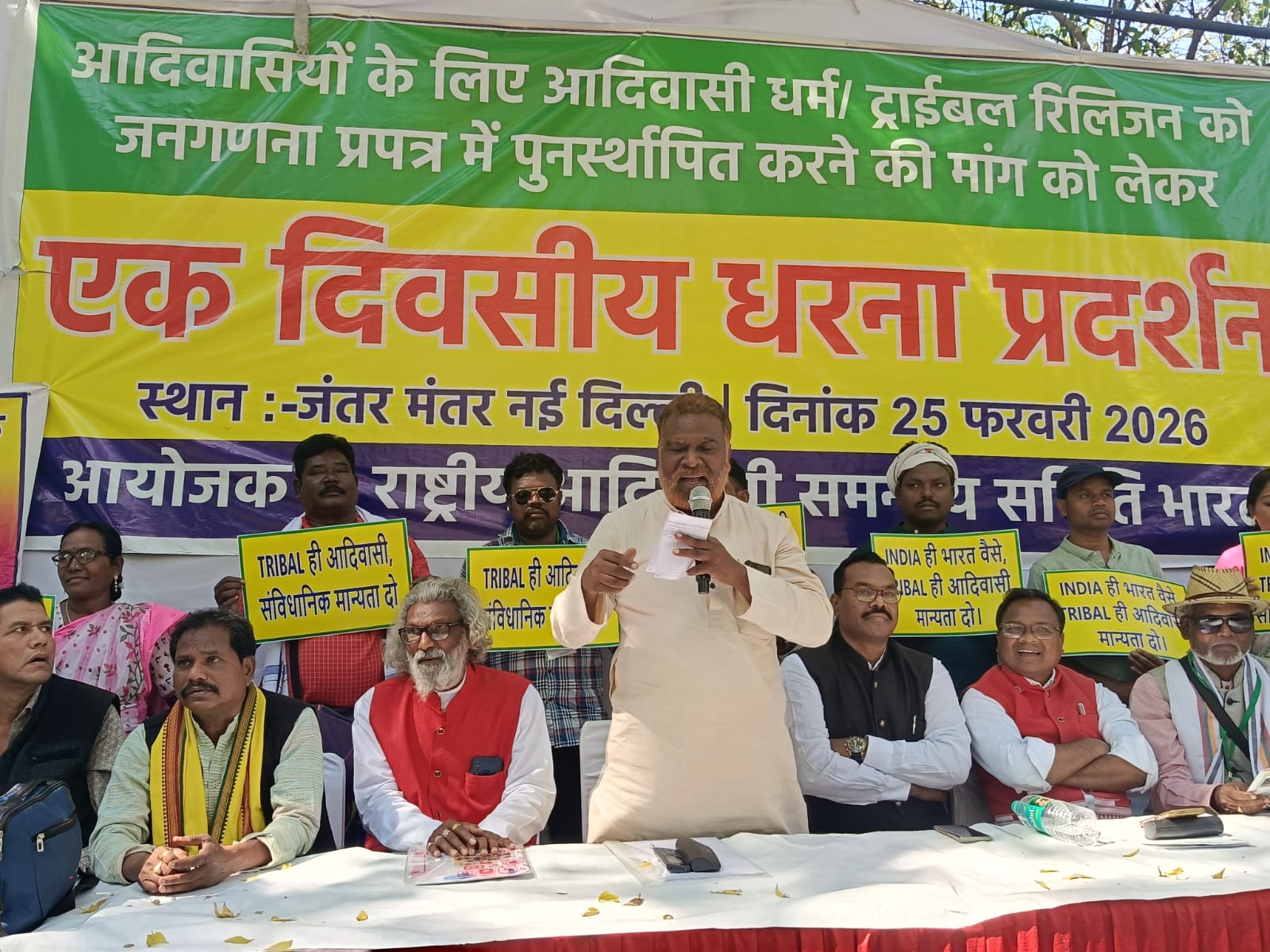 झारखण्ड से देव कुमार धान, गीताश्री उरांव, प्रेमशाही मुंडा, अभयभूट कुंवर, सर्जन हॉसदा, चंदन होनहागा, दर्शन गंझु, आसोतोष सिंह चेरो, हरि नारायण महली। गुजरात से लालू भाई बसावा, उत्तम भाई बसावा। राजस्थान से डॉ. हीरा मीना। छत्तीसगढ़ से विनोद नागवंशी, रमेश ठाकुर लोकेश्वरी नेताम महेंद्र नेताम। मध्यप्रदेश से -भूवन सिंह कोराम। महाराष्ट्र से विश्वनाथ बाकड़े, प्रहलाद सिडाम। उड़ीसा से मंगला खलको। उत्तर प्रदेश से बबलू धाँगर। बिहार से सुदामा उराँव। पश्चिम बंगाल से मोती लाल सोरेन, मैनेजर साह मरकाम, भरत प्रसाद खरवार, राजेश कोल, जनार्दन कोड़ा एवं अन्यान्य।आदिवासी धर्म कोड को जनगणना प्रपत्र में शामिल करने की मांग को लेकर आज दिनांक 25 फरवरी को जंतर मंतर नई दिल्ली में एक दिवस धरना प्रदर्शन आंदोलन सम्पन्न हुआ