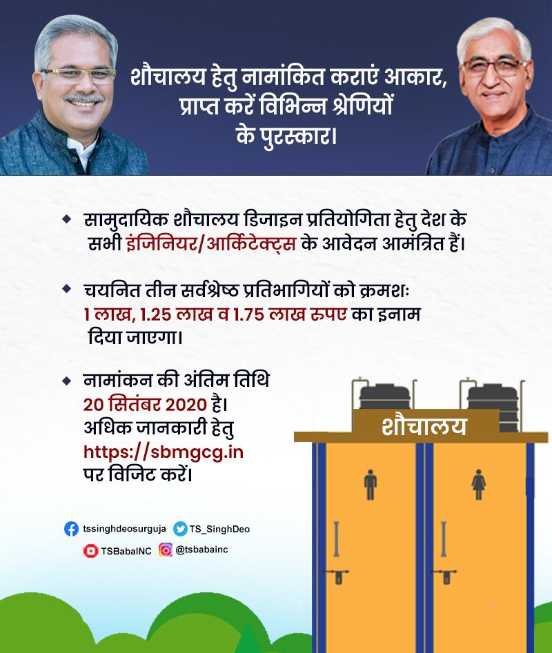 सामुदायिक शौचालय के उत्कृष्ट ड्राइंग-डिजाइन तैयार कर आर्किटेक्ट और इंजीनियर पौने दो लाख रूपए तक का पुरस्कार जीत सकते हैं। स्वच्छ भारत मिशन (ग्रामीण) द्वारा राज्य स्वच्छता पुरस्कार-2020 के अंतर्गत साढ़े तीन लाख रूपए, साढ़े चार लाख रूपए और साढ़े पांच लाख रूपए लागत के सामुदायिक शौचालय के सर्वश्रेष्ठ मॉडल को क्रमशः एक लाख रूपए, सवा लाख रूपए और पौने दो लाख रूपए का नगद पुरस्कार दिया जाएगा। इसके लिए 20 सितम्बर तक आवेदन किए जा सकते हैं।
